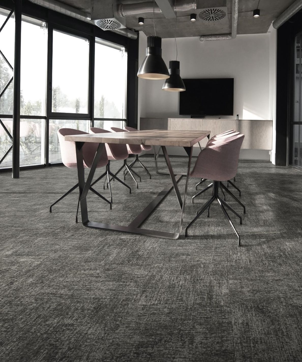 Course of Action is just that—a perfectly scaled pattern to keep the momentum. Small meeting areas and focus rooms call for a more toned-down vibe. Simple and elegant, Strictly Business quiets the room like a whisper. And like any great pairing, Course of Action and Strictly Business bring out the best in each other, each benefit from the companionship of the other, in an overlapping palette of cream, warm and cool grays, taupe, black, and navy. Now let’s get back to work.